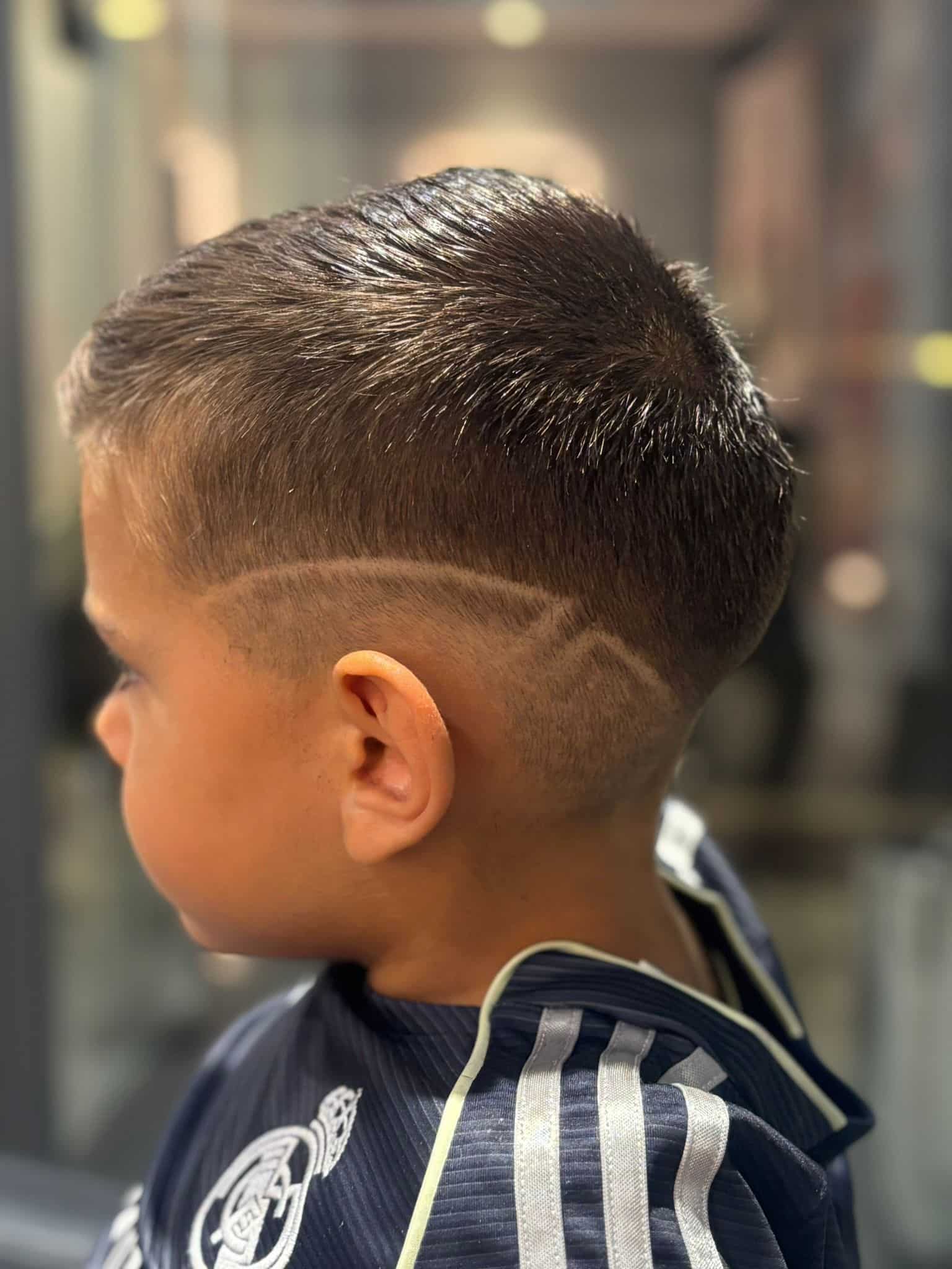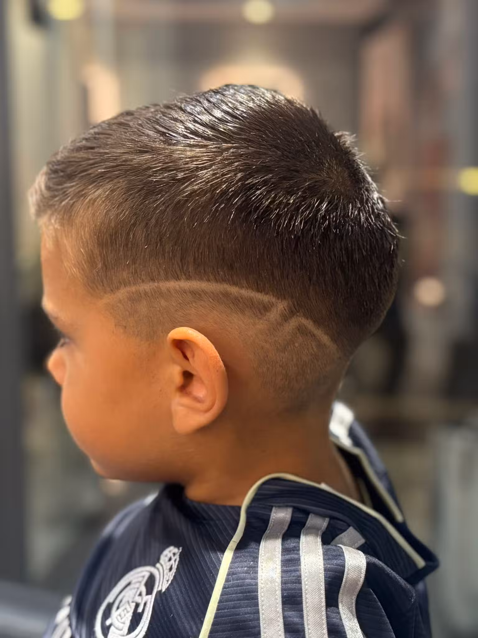 Lo más destacado es el diseño en forma de línea curva en el lateral, que añade dinamismo y originalidad al look. Este tipo de corte es ideal para niños que quieren lucir con actitud y estilo, reflejando confianza y frescura.