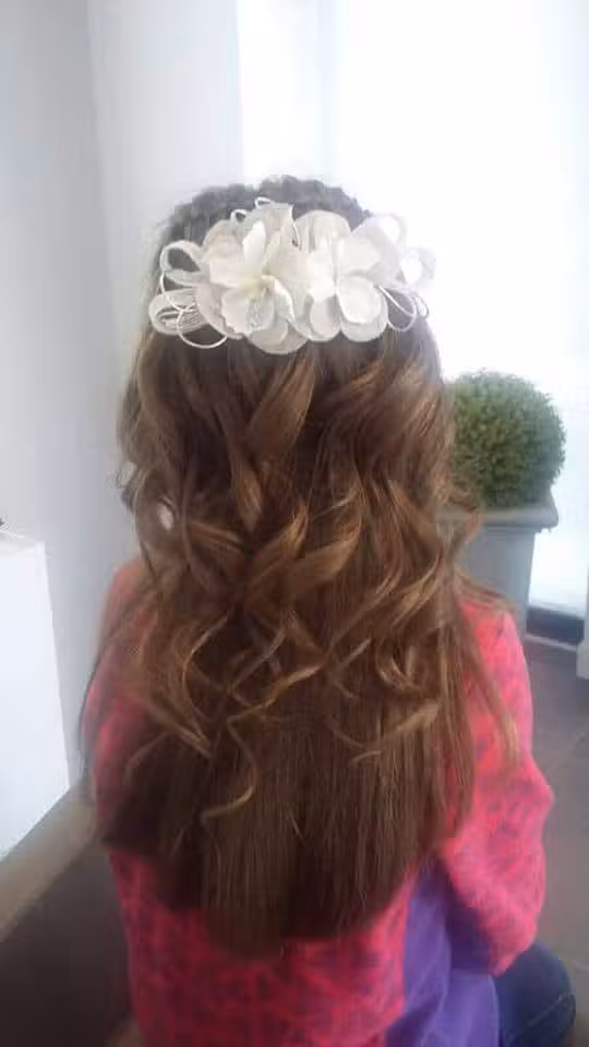 Hemos elegido un semirecogido con ondas muy marcadas y rematando por detrás con un tocado de flores, así la cara de la niña queda despejada y se puede apreciar mejor su sonrisa.
