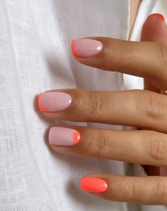 El otoño no tiene por qué ser sinónimo de colores apagados. Esta manicura demuestra que la alegría también puede llevarse en las uñas. El contraste entre el tono nude rosado y los toques vibrantes de coral neón crea un equilibrio perfecto entre elegancia y diversión.