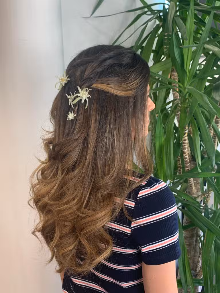 Si también el día de tu boda quieres lucir tu melena, este peinado que mostramos es perfecto para ti, cabello suelto con ondas, nuestra clienta quiso añadir cómo único adorno unas pequeñas y delicadas flores de nieve.