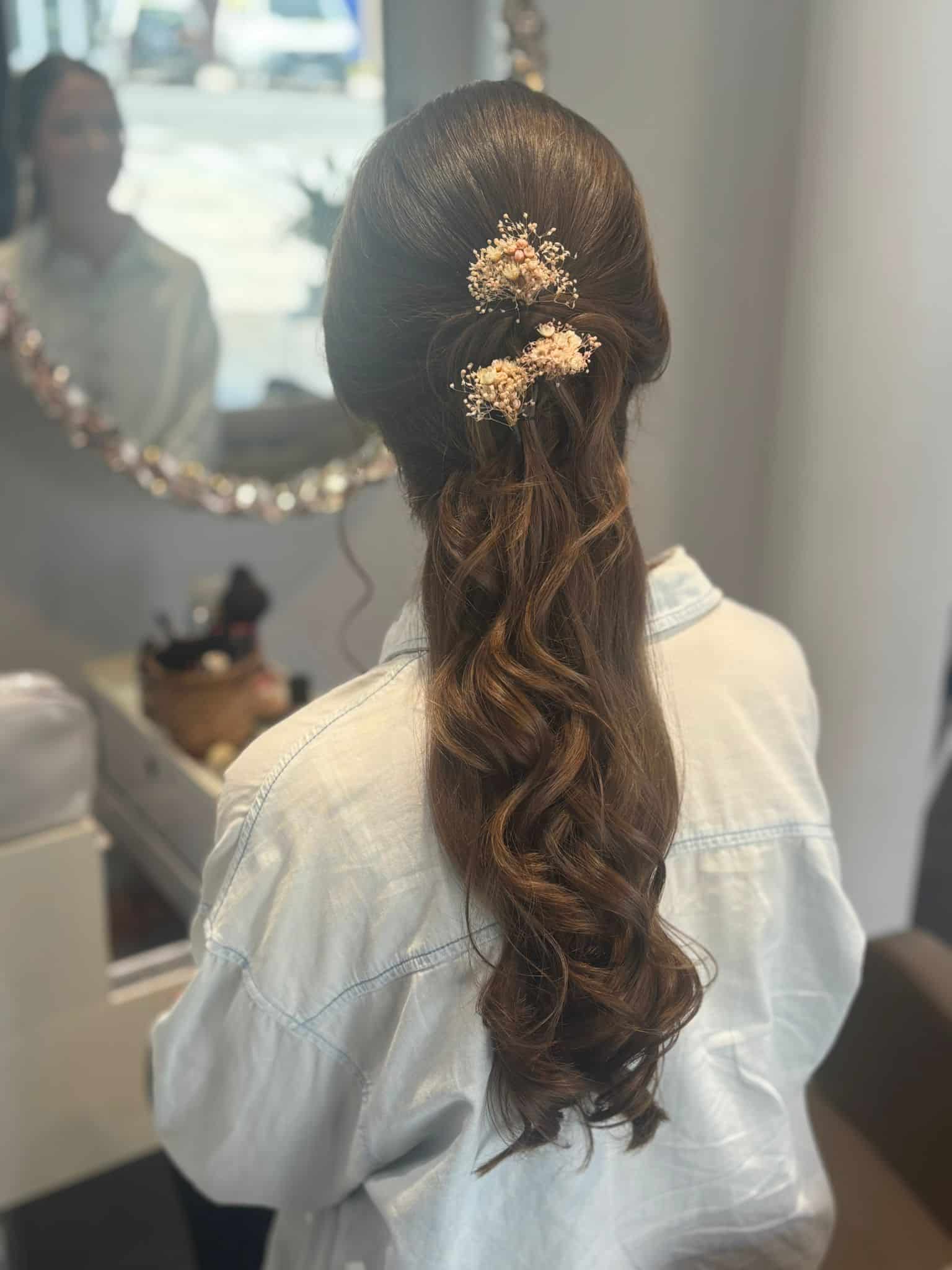 Un look perfecto para una novia que busca elegancia sin perder la naturalidad. Este peinado combina ondas suaves y definidas con un medio recogido delicado, realzado con pequeños detalles florales en tonos crema y rosa pastel que aportan un aire bohemio y sofisticado además de de frescura y romanticismo.