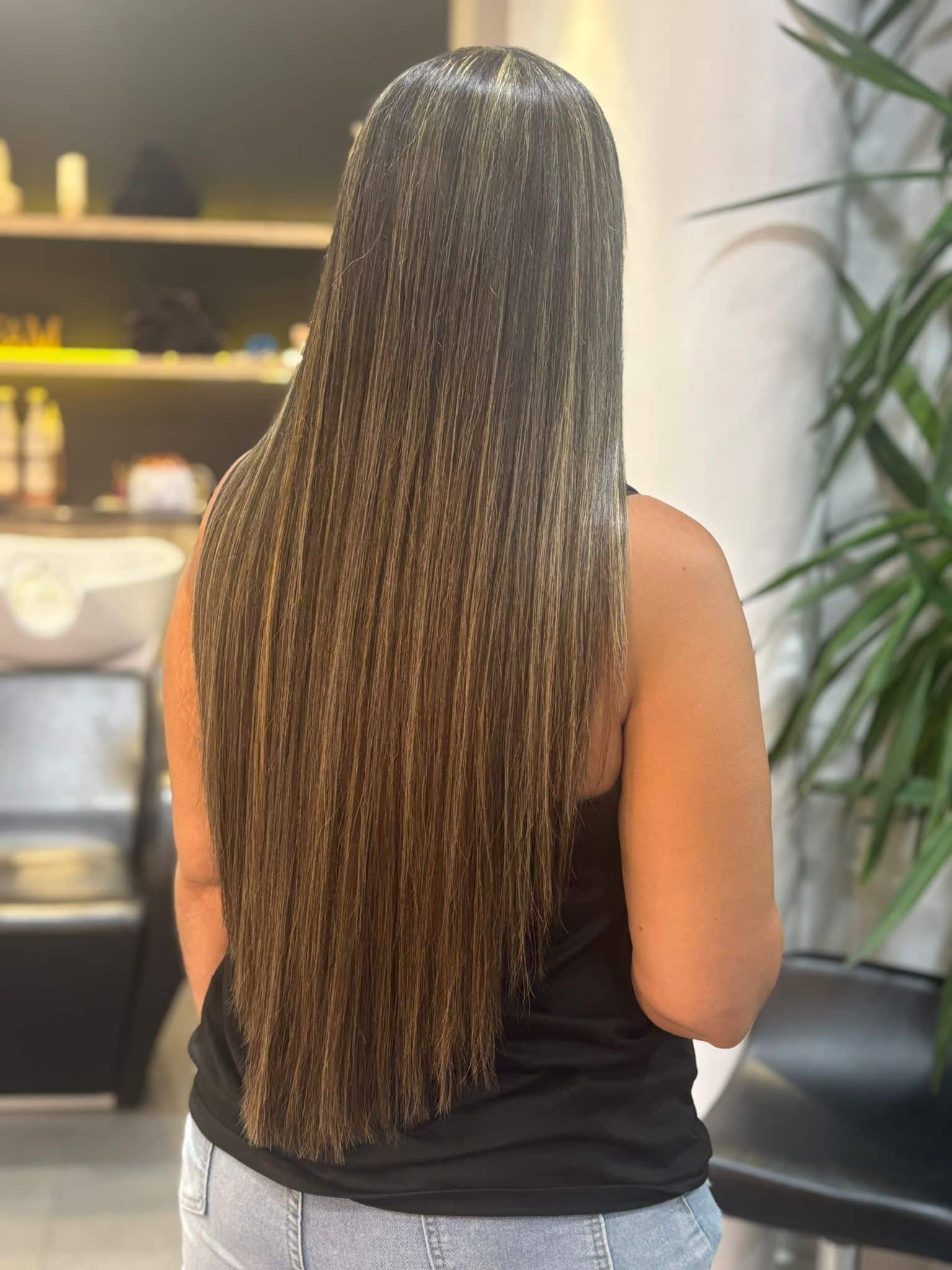 Este peinado es el resultado de una melena cuidada, trabajada con precisión y mimo. El alisado realza la suavidad del cabello, dejando una textura sedosa y uniforme que refleja la luz en cada paso.