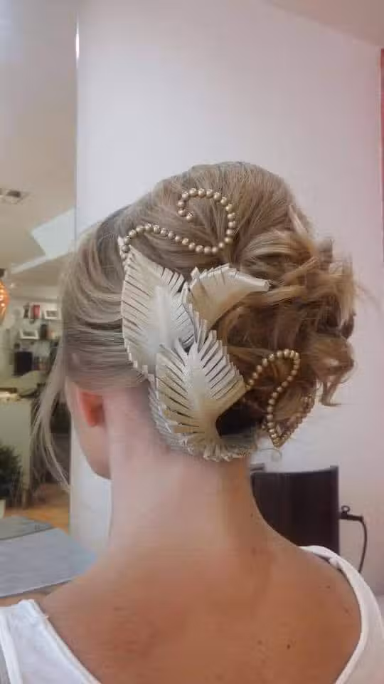 Elvira nos visita desde Teruel, supo de TupeluAinsa a través de nuestra web y de nuestra página de Facebook lo cuál para nosotros es una gran satisfacción, le hicimos un precioso recogido moderno y muy actual, pero lo que más destacaba era el maravilloso tocado que lucía, hojas de un tamaño mediano con espirales de metal.