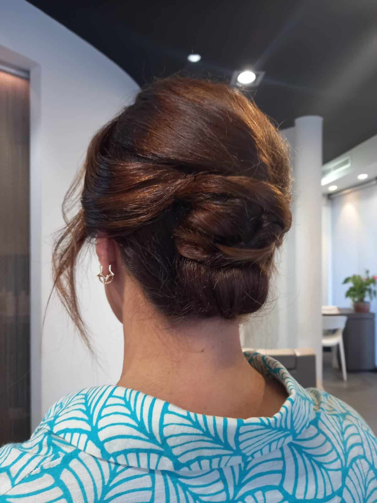 Este peinado se caracteriza por su elegancia discreta y su acabado suave. El cabello se recoge en la parte baja con un retorcido que aporta forma y movimiento, creando una estructura equilibrada y armoniosa. Los mechones sueltos alrededor del rostro añaden frescura y un aire natural que realza la belleza de cada facción.