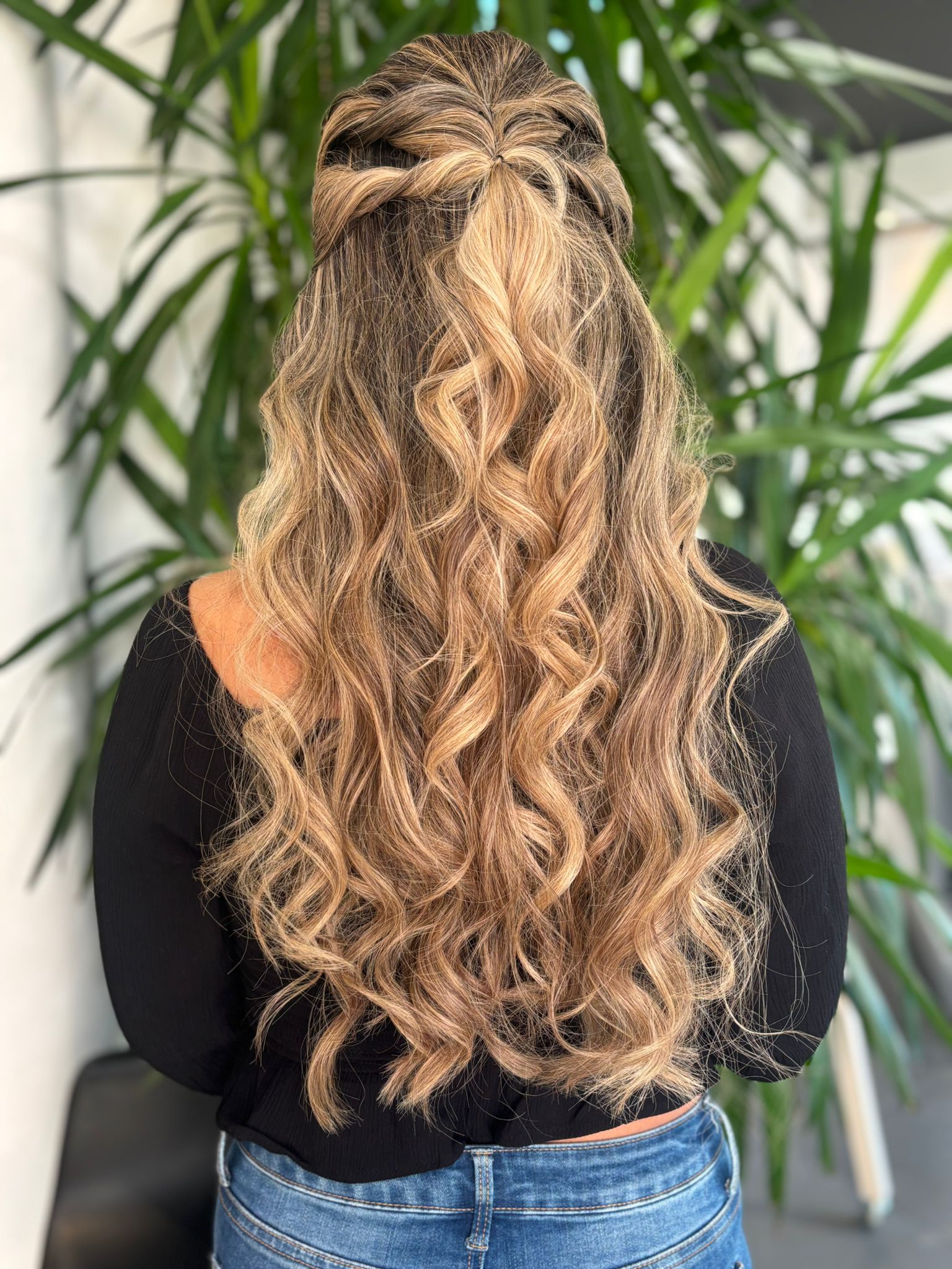 Este peinado combina lo mejor de dos mundos: la libertad de una melena suelta y el encanto de un recogido sutil. Las ondas suaves aportan volumen, textura y ese aire romántico que nunca pasa de moda. La parte superior recogida realza el rostro y da protagonismo a la mirada, mientras el resto de la melena cae con naturalidad, dejando que cada rizo hable por sí solo.