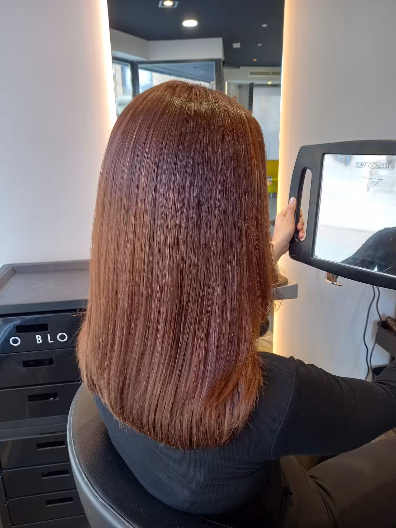 El color del peinado que os mostramos hoy en imagen es un tono otoñal cálido, una mezcla armoniosa entre cobre suave y castaño avellana que refleja la luz de manera delicada. Este matiz aporta profundidad y brillo, evocando los colores de las hojas secas y la calidez de la temporada. El resultado es un estilo elegante y muy favorecedor, ideal para quienes buscan un look sofisticado con un toque acogedor propio del otoño.