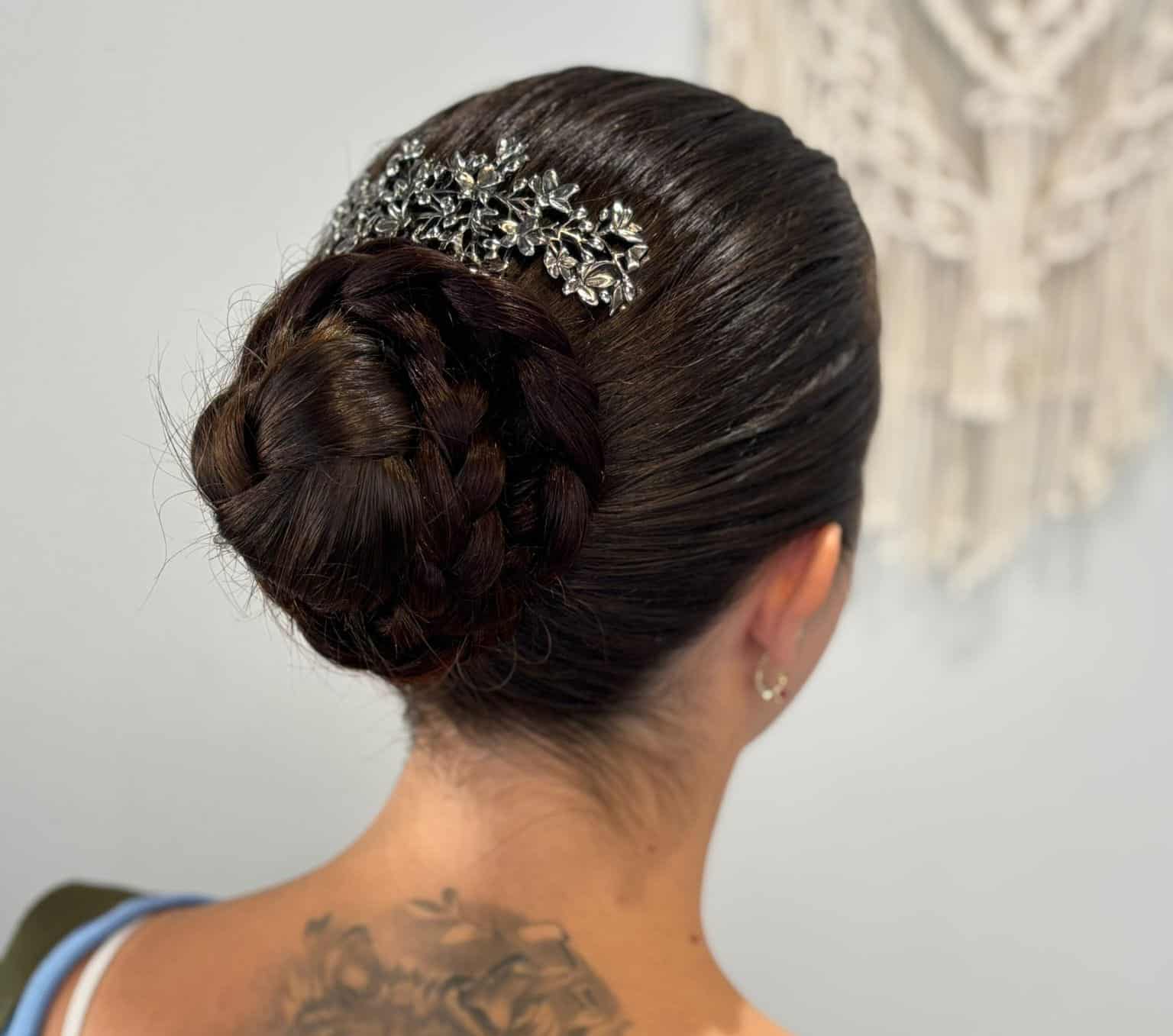 Este peinado combina la pulcritud de un moño bajo con el encanto de una trenza envolvente, creando una silueta romántica y sofisticada. El accesorio plateado con detalles florales añade ese toque de luz y distinción que toda novia merece en su gran día. Diseñado para realzar la belleza natural, respetando la forma del rostro y dejando que cada detalle cuente.